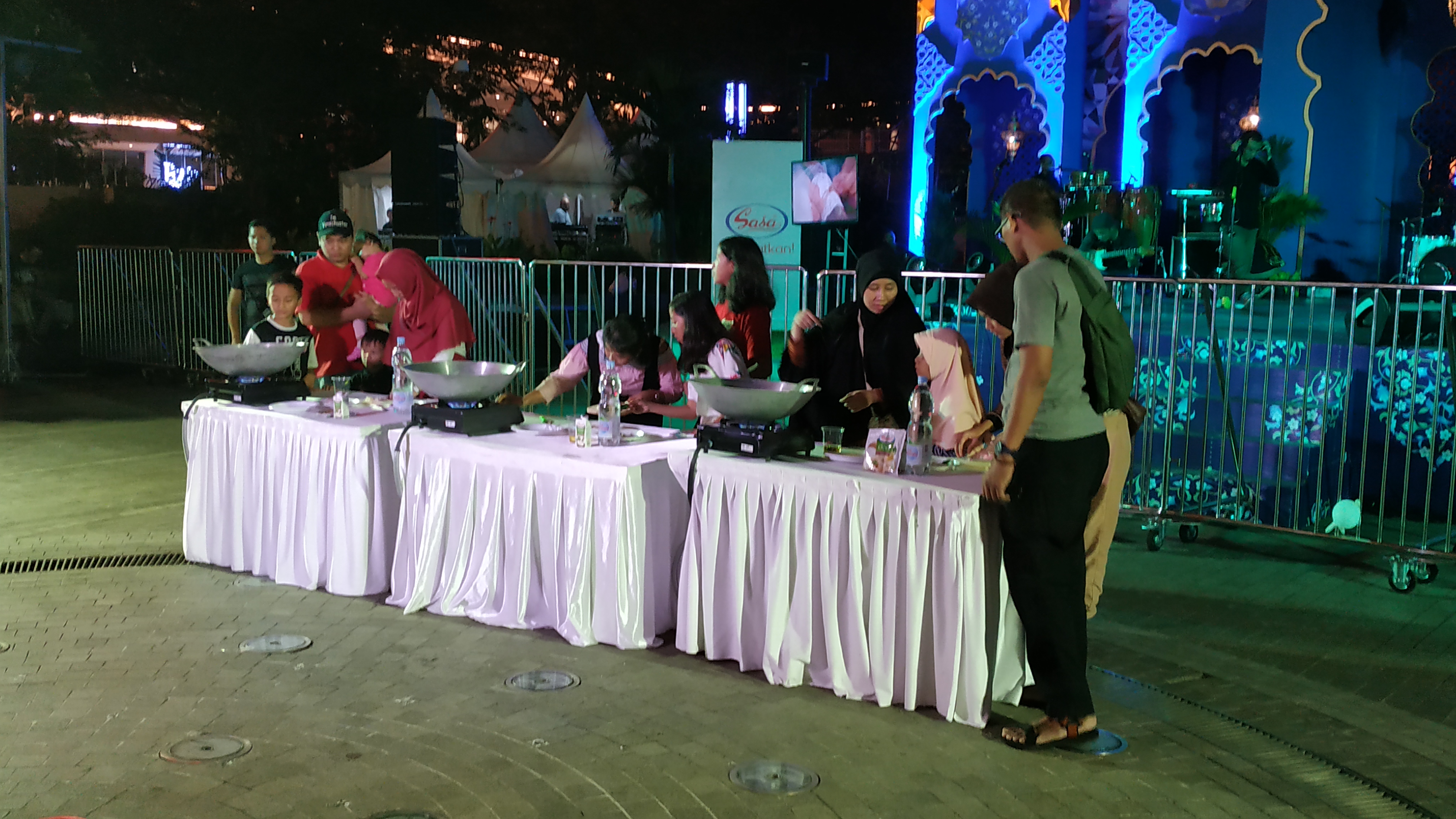 Foto 4. Demo masak oleh Chef KongsFoto 5. Area Lounge Corner yang disediakan untuk keluarga yang membawa anak dimana anak-anak tersebut dapat duduk santai sambil menonton kartun yang ditayangkanFoto 6. Para pengunjung yang ikut serta memeriahkan acara untuk pemecahan rekor MURI yaitu memasak 1440 mangkuk soto secara estafetFoto 7. Orang yang memukul bedug saat pengumandangan takbir yang menjadi penanda untuk orang-orang yang berpuasa agar dapat berbukaFoto 8. Pengunjung yang mengikuti lomba masakFoto 9. Talkshow makanan bersama food influencer, Nex Carlos (tengah)